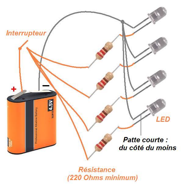 Avec une pile de 4,5V, des LED et des résistances,