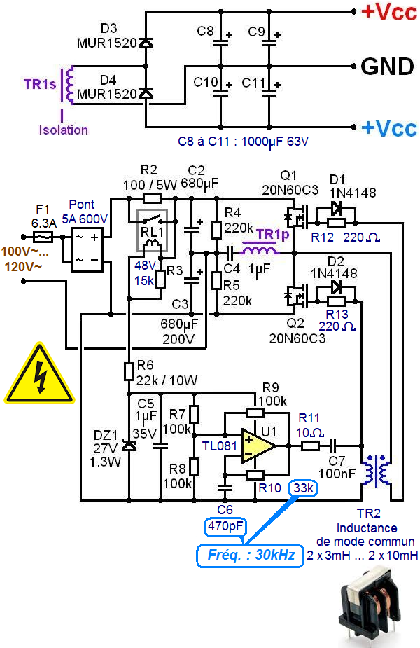 Voici un schéma très simple d'alimentation à découpage 110V ou