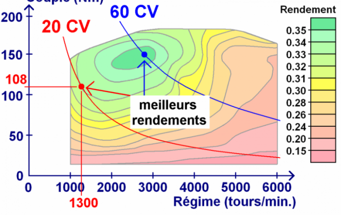 Pour chaque puissance, il existe un régime optimal. L'article précédent a mis en évidence le chemin de meilleur rendement pour