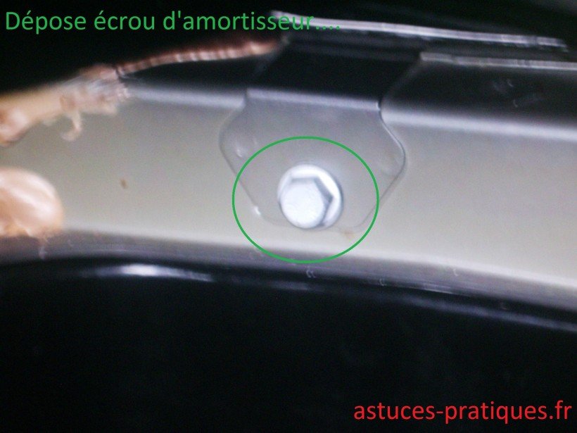 Attrapper l’amortisseur et le déposer par le dessous. Comparer la pièce usagée avec la neuve. ATTENTION ! Avant d’installer l’amortisseur neuf il faut l’activer en appuyant dessus et attendre qu’il se détende tout doucement au moins 3 fois de suite. Il ne reste plus qu’à poser l’amortisseur neuf en faisant attention de le mettre dans le même sens que l’ancien. Pour la pose de celui-ci procéder à l’ordre inverse des opérations ci-dessus.