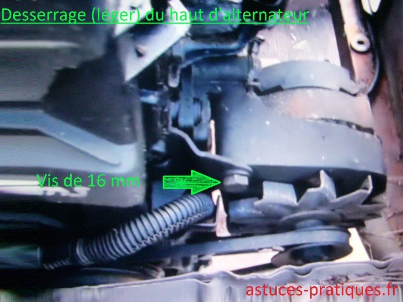 Soit en desserrant un peu la vis de 13mm l’alternateur va basculer tout seul, soit il va falloir dessserrer un peu plus la vis et agir sur l’alternateur avec la main pour qu’il bascule. Cela va détendre au maximum la courroie et on pourra donc la déposer.