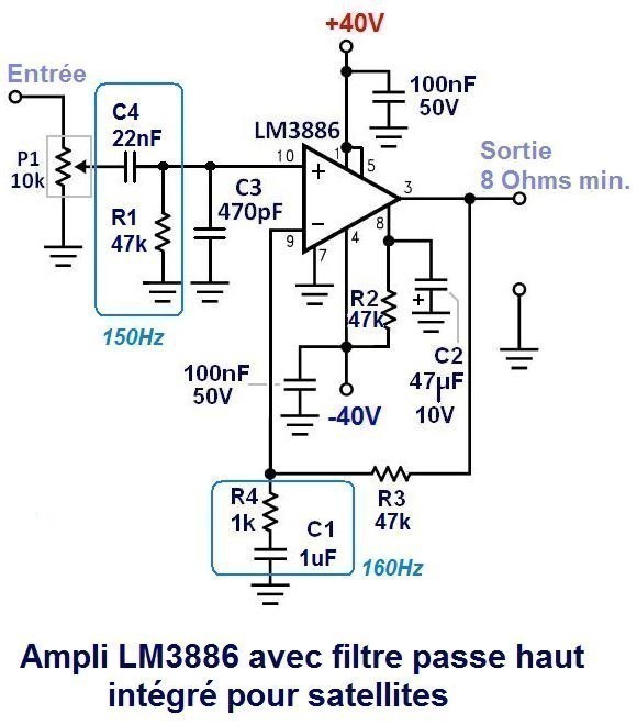 Schéma d’ampli avec LM3886 pour satellites (filtré passe haut)
