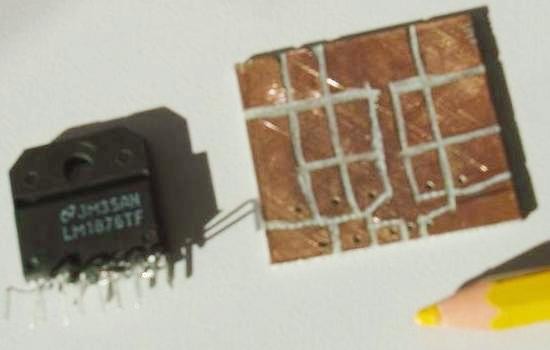 Pour réaliser rapidement un petit ampli autour du LM1876, on peut utiliser un petit circuit imprimé de 2.5cm de coté