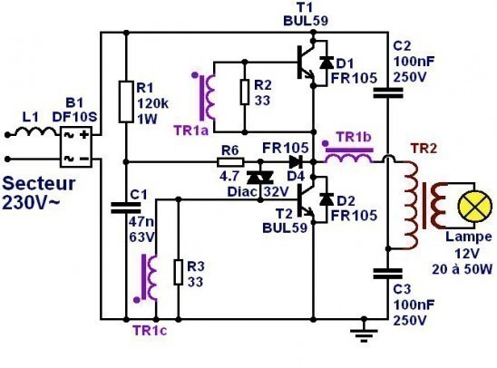 Le transfo électronique est une alimentation à découpage en demi pont. La tension de sortie va directement à l'ampoule et