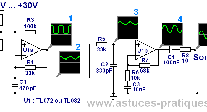 Voici un schéma simple d'oscillateur générant un sinus et qui nécessite pas d'ajustement comme un pont de Wien. L'oscillateur est