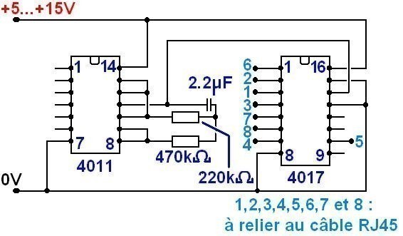 Voici un schéma de testeur de câble RJ45 qui détecte l'ordre des fils et l'absence de court-circuit entre deux fils.