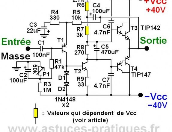 Voici un schéma d'ampli ultra simple et de grande puissance jusqu'à 200 Watts avec seulement 4 transistors au total. Le