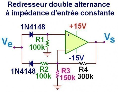 Ce redresseur double alternance présente une impédance d'entrée constante que la tension d'entrée soit positive ou négative. On peut fixer