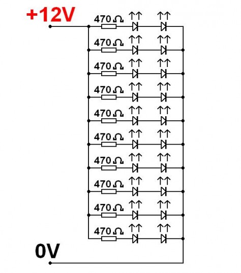 Voici le schéma le plus simple pour monter 20 LED (ou plus) sur une tension de 12V. Il faut donc une tension continue 12V (entre 9V et 15V), les 20 LED et 10 résistances 470 Ohms 1/4W standard.