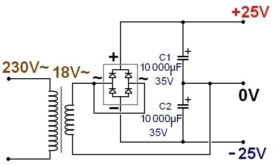 Pour créer une tension symétrique, un transfo à tension simple et un pont de diodes placé astucieusement suffisent grâce au
