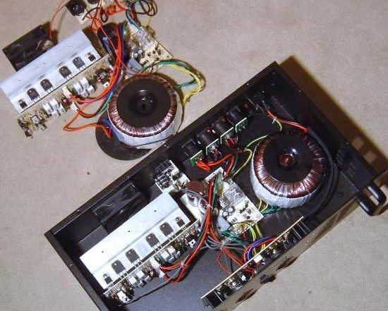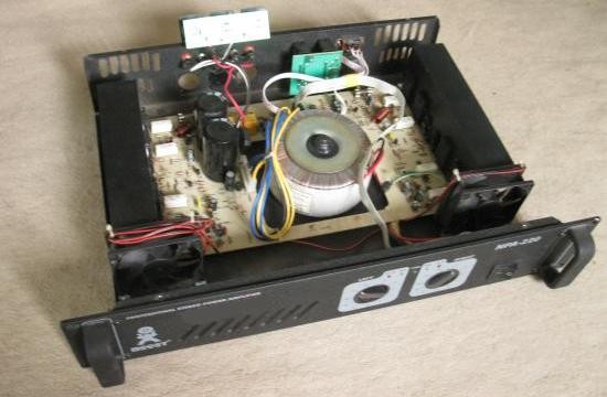 L'intérieur de l'ampli BOOST NPA220 est classique, basé sur un bon transfo torique et des radiateurs en alu sur chaque