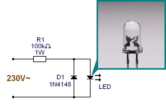 Il suffit d'une résistance et d'une diode pour brancher une LED sur le secteur 230 V (anciennement 220 V) directement