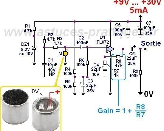 Basé sur un seul ampli op, ce préampli micro électret est ultra simple. Il permet d'utiliser les petits micros à