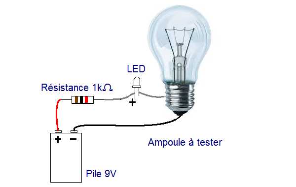 Une ampoule halogène ou à incandescence peut être testée avec une pile et une LED pour vérifier le bon passage