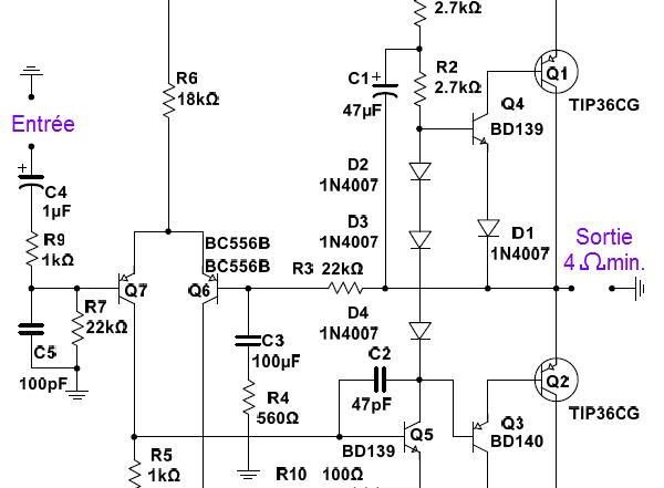 Un ampli de 100 Watts RMS peut être fait avec deux transistors de puissance PNP. Le schéma est donné ici