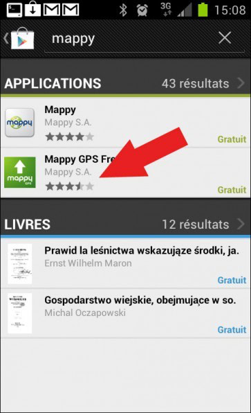Cette application est sans aucun doute la meilleur de toutes celles gratuites.Ses points positifs:– Gratuite- Rapidité de chargement- Rapidité de géolocalisation- Précis- Carnet d’adresse complet- des dizaines de pays disponibles- offline ( il n’a pas besoin d’internet pour fonctionner )Pour la télécharger ouvrez le android market ou le play store de google, et lancez la recherche avec le mot clé « mappy« Choisissez « Mappy GPS Free » .