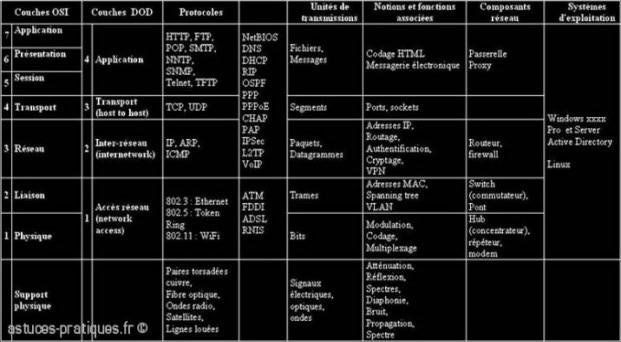 Le tableau du modèle OSI est composé de plusieurs couches normalisées. Chaque composant utilisé dans le transport de données par