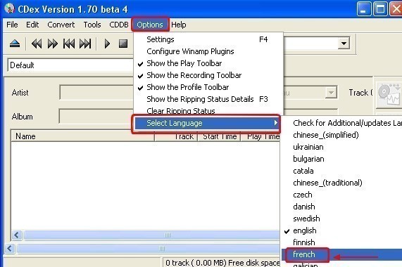 Par défaut la version 1.70 beta 4 de CDex est en Anglais. Pour mettre le CDex en