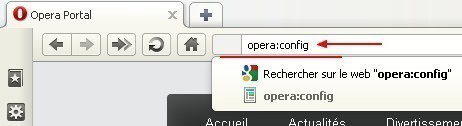 Dans la barre de navigation d’Opera tapez opera :config et tapez ensuite sur entrée pour accéder à l’éditeur de préférences d’Opera