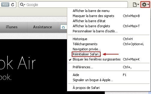 Nous allons remettre les options de Safari à leurs valeurs par défaut. Cliquez sur l’écrou qui symbolise les options