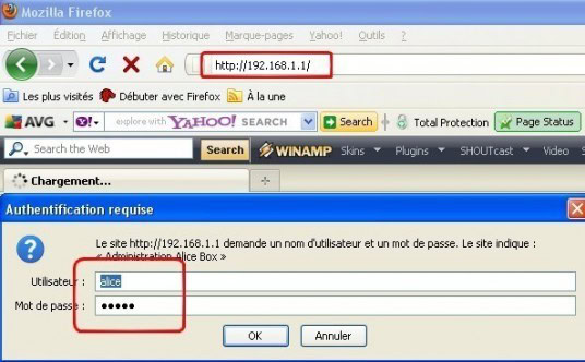 Premièrement, pénétré votre Alice Box en lançant votre navigateur et en tapant l’adresse IP de celle-ci (192.168.1.1). Tapez comme nom
