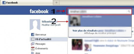 Sur votre page d’accueille de Facebook, tapez d’abord le nom de la personne que vous voulez rechercher dans la barre