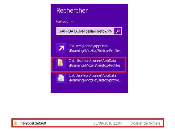Il existe une deuxième manière de procéder (sur Windows 8 et Windows 10) et qui est la suivante :Sur votre écran de démarrage, cliquez sur la tuile Bureau pour permettre à ce dernier de s’ouvrir. Une fois dessus, pointez la souris vers le coin intérieur droit de l’écran pour ouvrir « la barre des charmes ». Votre volet de recherche va s’ouvrir. Dans ce champs écrivez, comme précédemment : %APPDATA%/Mozilla/Firefox/Profiles/. Vous n’avez pas besoin de cliquer sur « OK » car une liste de dossier va apparaître. Cliquez sur le dossier voulu. Ce dernier s’ouvrira dans une autre fenêtre. Si vous n’avez qu’un seul dossier, ce dernier doit comporte le terme « défaut ».