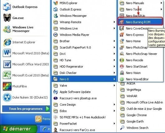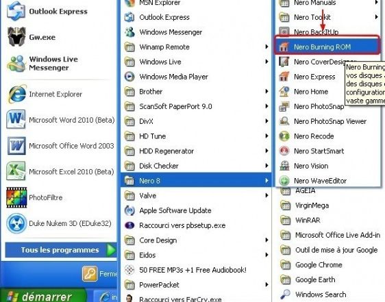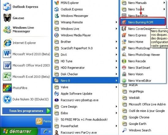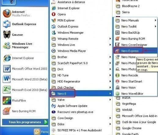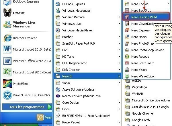 Pour commencer lancer Nero (démarrer, tous les programmes, Nero, Nero Burning Rom.exe) Mettez le