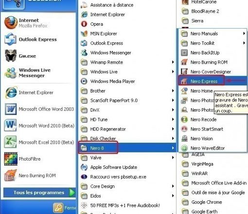Premièrement, lancer Nero Express (démarrer, tous les programmes, Nero, Nero Express) Allez dans